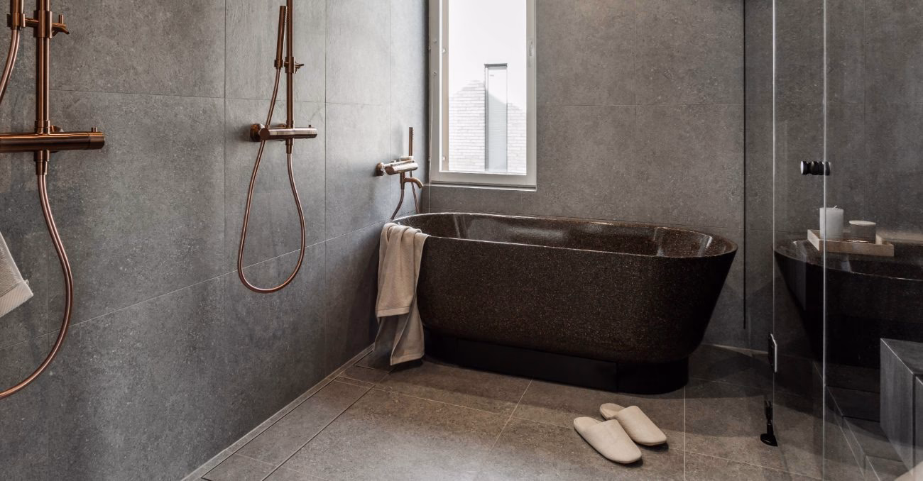 Baderomsinspirasjon – I Villa Musicas bad ble det valgt flislagte linjesluk som smelter inn i gulvflaten.