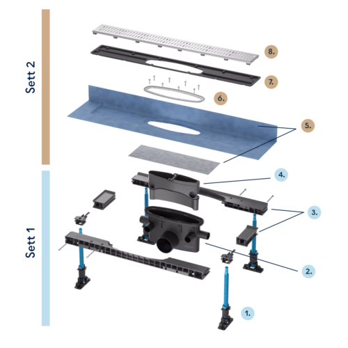 Den modulære monteringsplaten, som kan justeres ovenfra (3), tilpasses til valgt Kaita‑lengde**. Slukmansjettene (6), som inngår i ristpakken, sørger for sikker og smidig vanntetting. Kaita‑linjesluk er sertifisert og kompatibel med de mest brukte tettesystemene.
